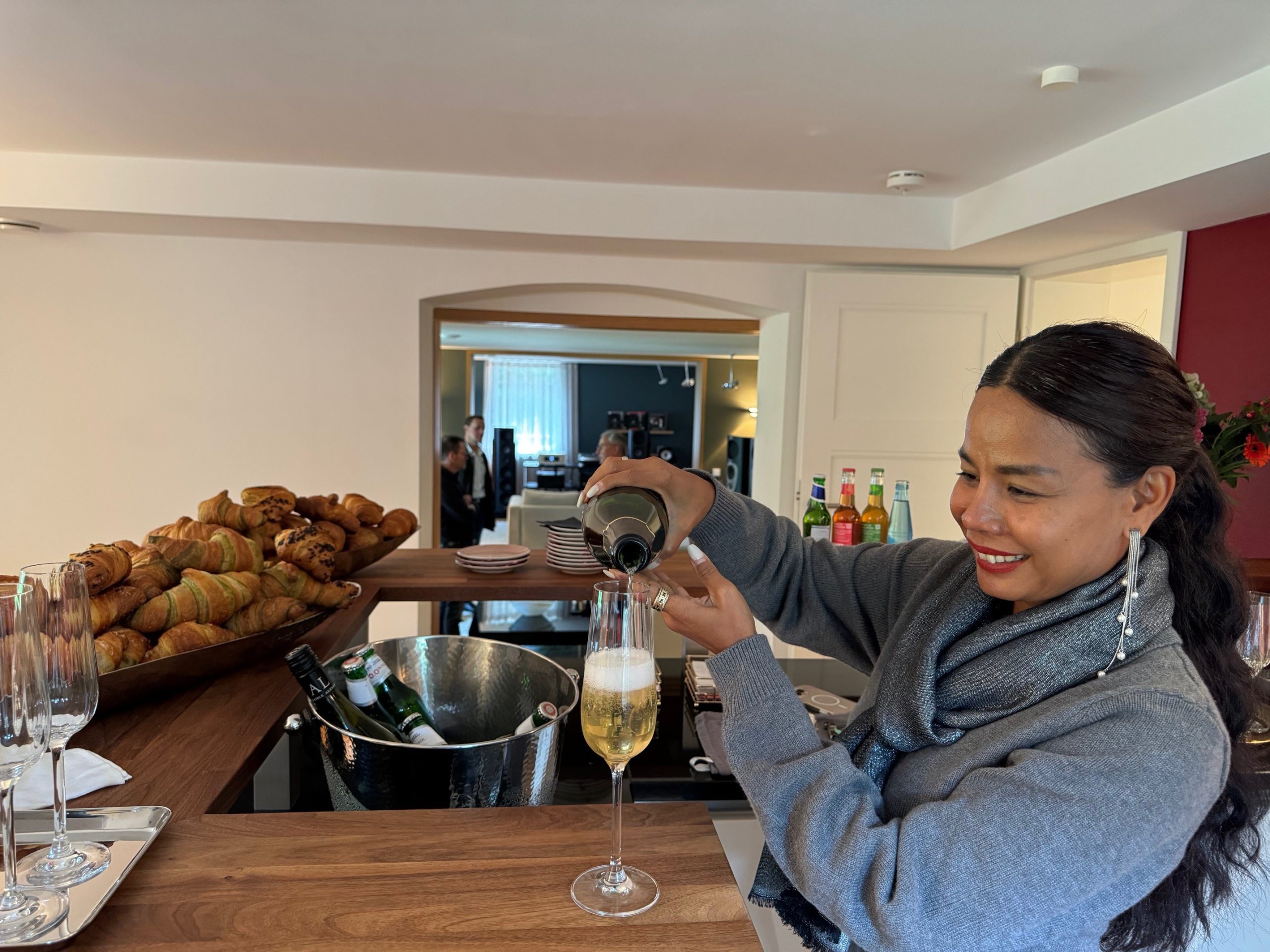 Stoßen Sie mit uns bei einem Glas Champagner auf die Zukunft des Heimkinos an und genießen Sie eine Vorführung auf beeindruckenden 120 Zoll.